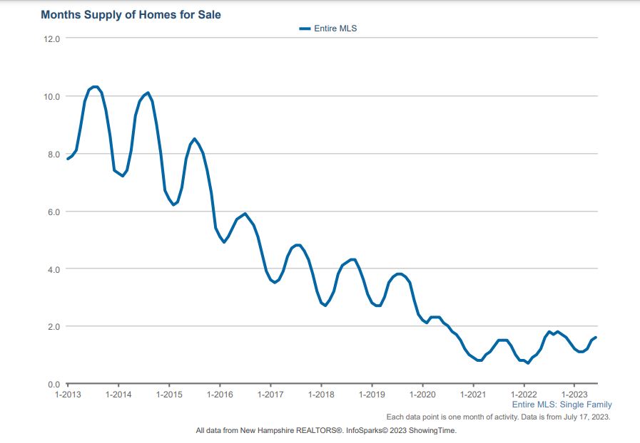 Summer is upon us, and the temperatures are heating up. However, the real estate market is a little cooler than normal this time of year due to the combination of extremely low inventory and higher borrowing costs, which has restricted the market activity going into traditionally strongest part of the selling season. New Hampshire is faring much better than the national market, with the National Association of Realtors reporting that home sales nationally are down 20.4% at the end of June, while NH is only down 7.2% year over year. This tight supply has kept prices trending upward, with the median home price hitting an all-time high of $499,000, a whooping 8.5% increase over the same period last year!