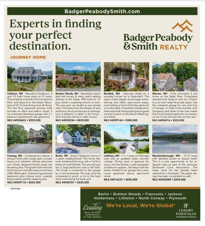 The Badger Peabody & Smith Realty Buyer's Guide appeared in mailboxes in the greater Central NH, Mt. Washington Valley and North Country during the last week of September 2023. This eight page full color guide shares market information, properties for sale and more.