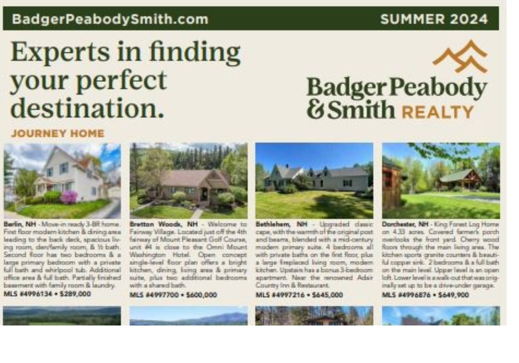 The Badger Peabody & Smith Realty Buyer's Guide appeared in mailboxes in the greater Central NH, Mt. Washington Valley and North Country during the week of July 22nd. This eight page full color guide shares market information, properties for sale and more.