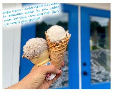 Super Secret Ice Cream is a secret no more! Located on Bethlehem's Main Street, Super Secret is a farm-to-cone shop and promises that "no weird stuff" goes into their ice cream, just New Hampshire milk and cream and ingredients made in their kitchen or sourced from local farms and trusted partners. Scoops, pints, ice cream sandwiches and more with flavors changing on a regular basis.