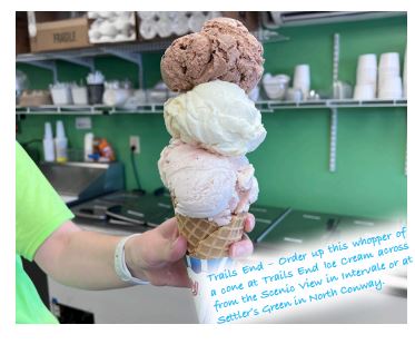 Find your favorite soft serve or hard ice cream at Trails End Ice Cream's two locations: in Intervale across from the Scenic Vista on Route 16 and at Settler's Green in North Conway. Along with cones Trails End features sundaes, banana splits, smoothies, shakes and hand packed pints. Sprinkles and smiles are free!