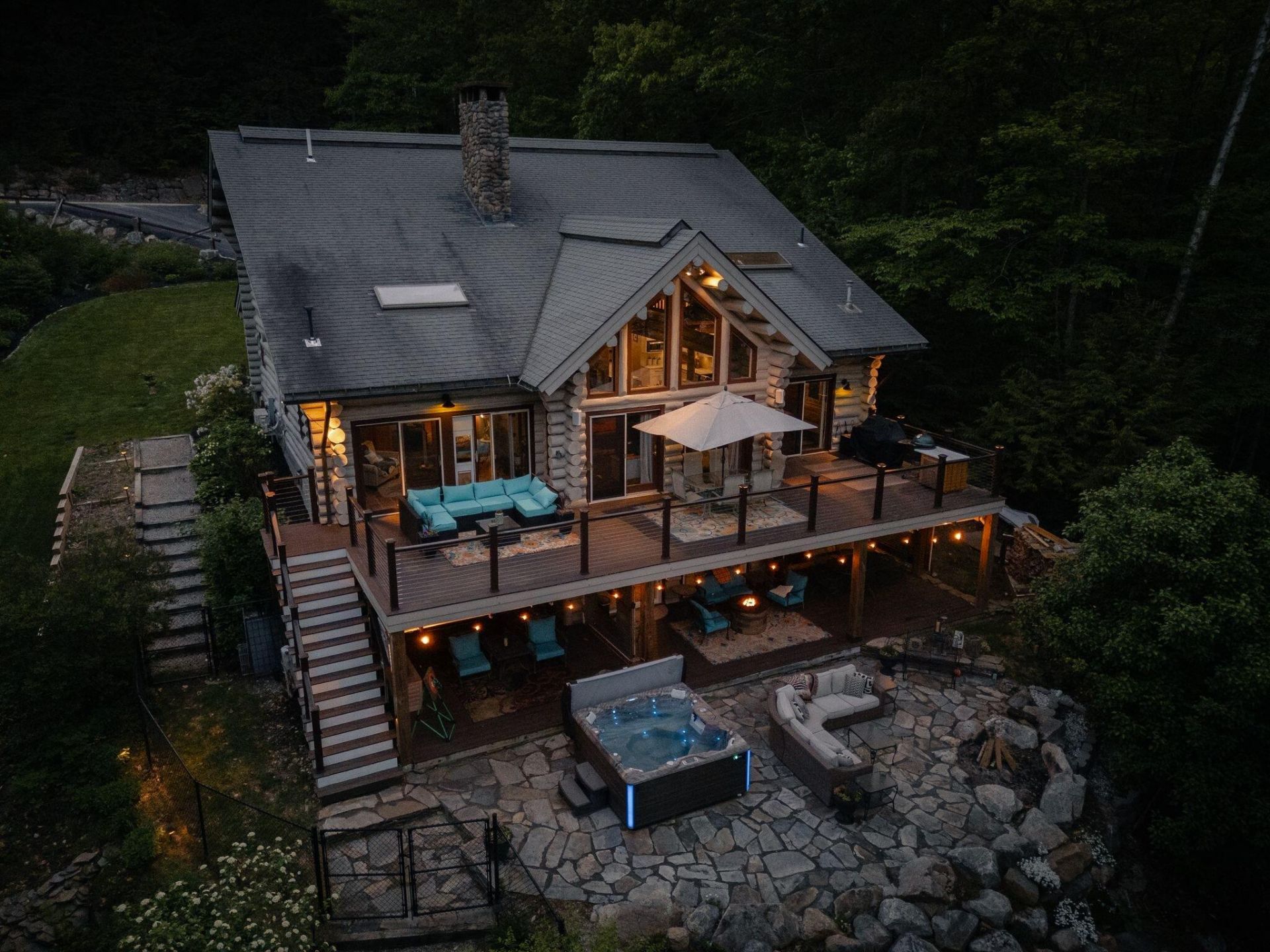 Experience lakeside luxury in this custom-built log home, crafted from hand-hewn Montana white pine. Now reintroduced with a fully redesigned driveway, which will be relocated and regraded to improve the slope, access, and parking. Completion expected by late May.Inside, cathedral ceilings and a floor-to-ceiling stone fireplace anchor the living room, while walls of glass capture sweeping lake views and fill the open-concept living, dining, and kitchen areas with natural light. Hickory hardwood flooring runs throughout. The chef's kitchen features custom hand-built cabinetry and leathered granite countertops.The first-floor primary ensuite features vaulted ceilings, a stone fireplace, walk-in closet, floor-to-ceiling windows with expansive lake views, and a renovated bath with quartz finishes, double vanity, makeup station, oversized dual-head shower, and radiant tile floors. A four season sunroom provides additional space and more lake views. Four access points lead to a large upper deck, ideal for entertaining.Upstairs includes a second primary ensuite with dual vanities and a tiled walk-in shower, plus two additional bedrooms, a full bath, and an open loft area.The finished walk-out lower level is designed for entertaining, featuring a second living area with pellet stove, river-table island, billiards space, sauna, and dedicated office. Step outside to the lower level deck and expansive stone patio with a fire pit and hot tub.Set on a private, manicured 1.62-acre lot with 205 feet of frontage and a sandy-bottom beach, the property includes extensive hardscaping, irrigation, full-house generator, two moorings, and an aluminum dock. Located just 10 minutes from Pleasant Mountain, it's perfectly situated for year-round recreation. Offered fully turnkey.
